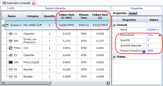 For example, the following picture shows the properties and results for two "System A" assemblies in a parallel (redundant) configuration. The Failure Rate (t=INF) column displays the steady-state failure rate for a single assembly (i.e., the constant failure rate as the mission time approaches infinity), while the Failure Rate(t) column displays the failure rate at the specified Mission Time of 8,760 hours for two assemblies in a redundancy configuration.