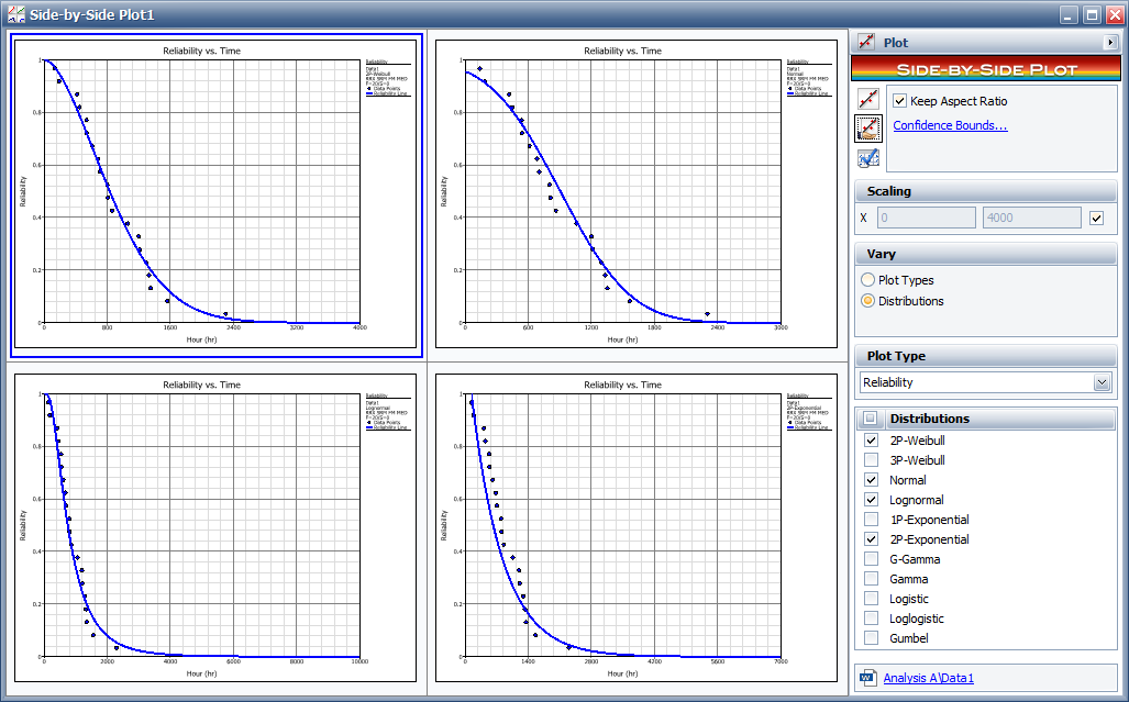 Available in Weibull++, ALTA and RGA, side-by-side plots give you the ability to display different plots for a single data set all in a single window for easy comparison.