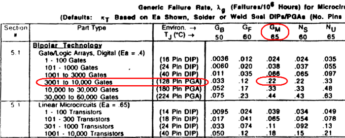 Assume you have four digital bipolar gate/logic arrays with 4,000 gates of Class S quality that have been in production for one year and will be operating in a Ground, Mobile environment.