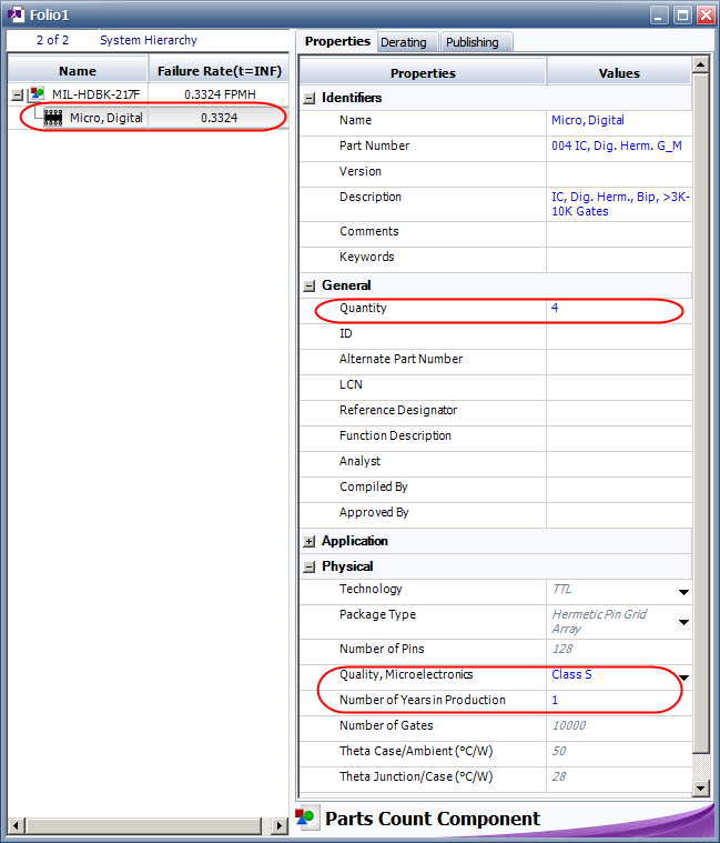 The system hierarchy shows that the calculated failure rate for the component, based on the parts count method, is 0.3324 FPMH, as shown next.