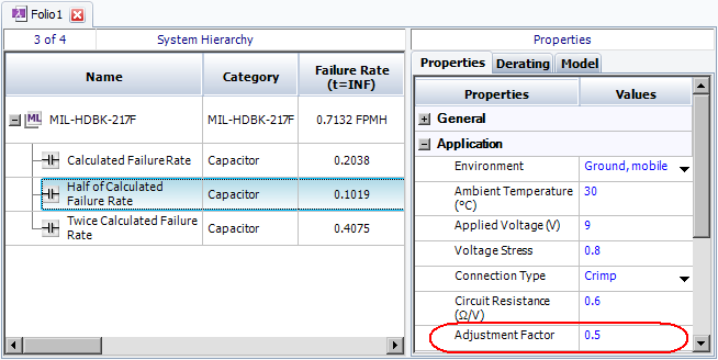 If you have reason to believe that the actual failure rate of a component will be half of the rate calculated by the prediction standard, you change the adjustment factor from 1 (the default) to 0.5.