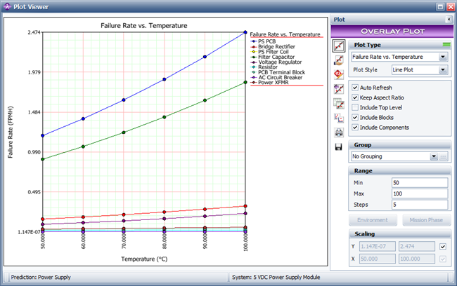 You will need to enter/select the value of the stress factor in the plot sheet's control panel. For instance, if you select to create a Failure Rate vs. Temperature plot, you will need to specify a minimum and maximum range for the temperature, as well as the number of points (or steps) to display on the graph. The following plot shows an example where the temperature range is from 50 to 100 ºC and the number of steps is set to 5.