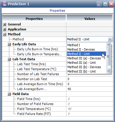 If you use Method II or Method III, you have to specify whether the test/field data were collected for the entire assembly (unit) or for the individual component (devices). The application will enable the appropriate Lab Test Data or Field Data properties based on your selection. For example, if you select the "Method II-Unit" option, the Lab Test Data properties will be enabled only for the block, but if you select the "Method II-Devices" option, those properties will be enabled only for the components under the block.