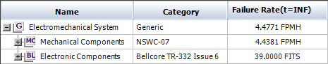 For example, in the picture above, the NSWC failure rate is shown in FPMH and the Bellcore failure rate is shown in FITS. Since the user has selected to show generic item results in FPMH, Lambda Predict automatically converts the FITS result (~39 failures per million hours = ~0.039 failures per billion hours) in order to calculate the combined results for both types of components (~4.4381 + ~0.039 = ~4.4771 FPMH).