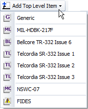 In Lambda Predict, a standard item represents a system or assembly that is analyzed using a particular reliability prediction standard (except in the case of generic items, which are discussed below). The most common way to add a standard item to a prediction folio is to choose System Hierarchy > Add Item > Add Top Level Item, and then select the prediction standard you wish to use.