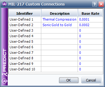 The software supports the connection types specified in the MIL-217 standard (e.g., Reflow Solder, Crimp, etc.) and also allows you to define up to 10 custom connection types for use in the Connection Type property. The same custom connections are shared by all users for all MIL-217 analyses within the current database. In a secure database, the ability to create custom standards will be accessible only if you have the "Manage Lambda Predict repository settings" permission.