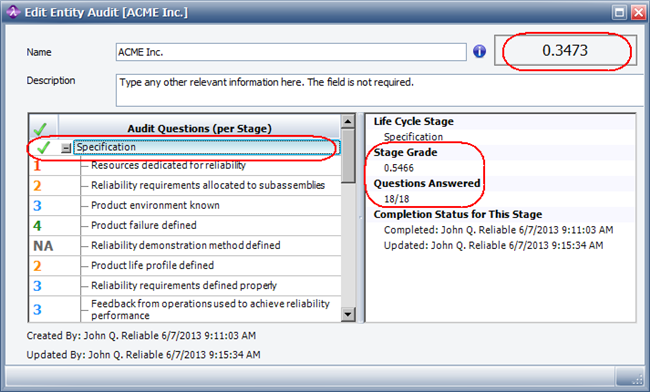For example, suppose that ACME Inc. receives a grade of 1.000 for the Specification stage (Level 4 processes), 0.6667 for the Design stage (Level 3 processes) and none of the questions are answered for the other stages that ACME is never responsible for. This results in an overall grade of 0.4307. When you later create a process audit in which ACME Inc. is responsible for those two stages of a particular product’s life cycle, the calculation will use 1.000 when ACME Inc. is responsible for the Specification stage and 0.6667 when it is responsible for the Design stage.