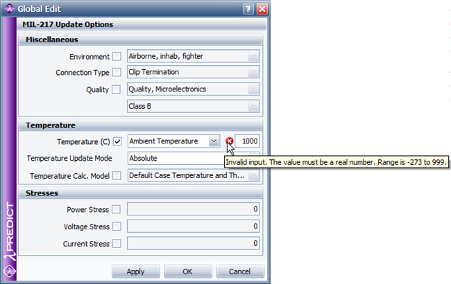 Global edit does not affect properties that have been automatically calculated by Lambda Predict. For example, the value of a capacitor's "Voltage Stress" property can either be automatically calculated (from its Rated Voltage and Applied Voltage properties) or entered directly into the field (by setting both the Rated Voltage and Applied Voltage properties to zero). If the capacitor's "Voltage Stress" property contains a calculated value, then any changes made to the same property in the Global Edit window will not affect that calculated value.