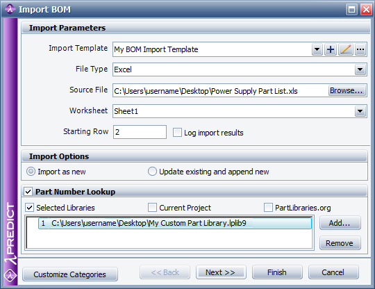 If you select the Part Number Lookup check box, Lambda Predict will compare each part number in the source file against predefined components in a) selected libraries b) the current project and/or c) PartLibraries.org. If there is a match, the application will automatically update the properties and/or failure rate of the component.