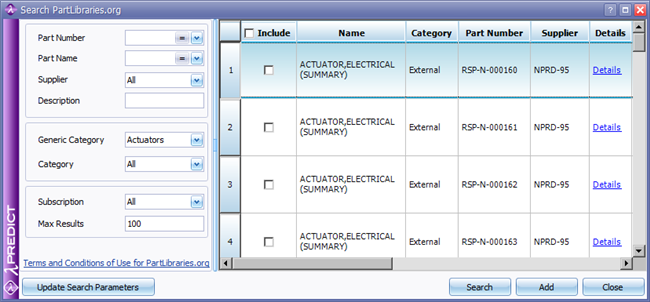 The Update Search Parameters button at the bottom of the table allows you to refresh the available search terms in the Supplier, Generic Category and Category drop-down lists. This will ensure that any new search terms added to PartLibraries.org since you last ran a search will be available for your use.