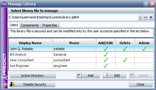 If you enable security, you can specify which user accounts can add/edit/delete component data from your library file. You can also give the role of Admin to other users. All other user accounts that do not have permissions for the file can still import component data from it so long as the file is saved in a location that they have read/write access to, but they will not be able to modify the contents of the file.