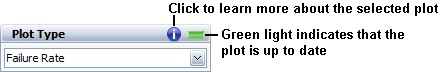 The Plot Type drop-down list provides a choice of applicable plots. To learn more about the selected plot, click the blue (i) icon. This area also contains an indicator light that displays the status of the top level item(s) it is associated with. If the light is green, then the plot reflects the current state of the top level item. If the light is red, then changes have been made to the top level item(s) or subsidiary items since the plot was last updated and you will have to update the plot by refreshing it.