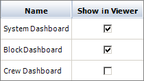 Use the check boxes in the Show in Viewer column to select which of the predefined layouts will be available to all database users via the Dashboard Viewer. If you clear a check box, the layout will not show in the viewer’s drop-down list but will remain in the manager’s list.