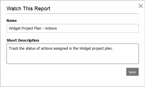 To watch a report, navigate to it in the website and click the Watch button or link, then enter the name and description that will show in your personalized list of "My Dashboards & Reports."
