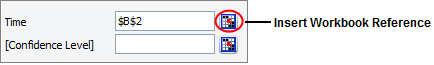 For example, if you want to obtain the probability of failure for the time that has been entered in cell B2, the function could be either =PROBFAIL(B2) or =PROBFAIL($B$2). You can type the cell location directly into the field or click the Function Wizard’s Insert Workbook Reference icon to insert the reference to the cell currently selected in the sheet. If you want to insert an absolute reference, press CTRL while you click the icon.