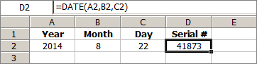 The DATE function uses the inputs of other cells to obtain the serial number. For example, if you have dates specified in three cells where A2=Year, B2=Month and C2=Day, =DATE(A2,B2,C2) returns the serial number for that date.