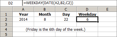 To return the day of the week for a date that is specified in three separate cells (A2=Year, B2=Month and C2=Day), use: =WEEKDAY(DATE(A2,B2,C2))