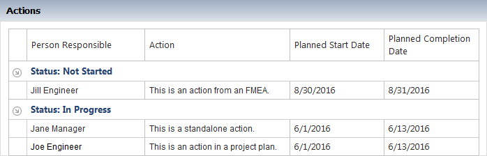 The website includes full details for any actions that are incorporated into a project plan or FMEA. If you have permission to edit an action in a desktop application, you can perform the same updates via the website.