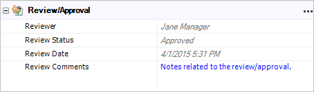Action resources can be marked for review and approval. If the Reviewer property is enabled in the configurable settings for the current project, you can click Show Review/Approval in the action ribbon to hide or display these fields for any given action.