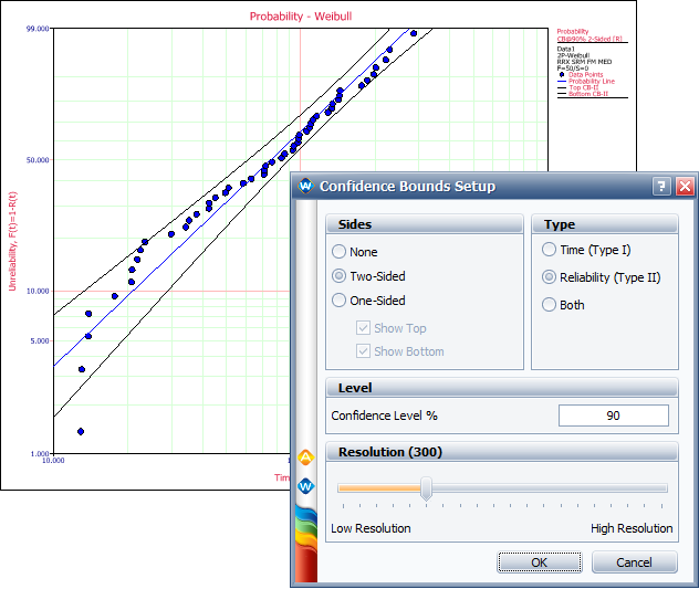 Depending on the type of data you are working with, you may be presented with different options for setting up the confidence bounds on the plot. (The ReliaWiki resource portal provides information on the background theory of confidence bounds at: http://www.reliawiki.org/index.php/Confidence Bounds.)