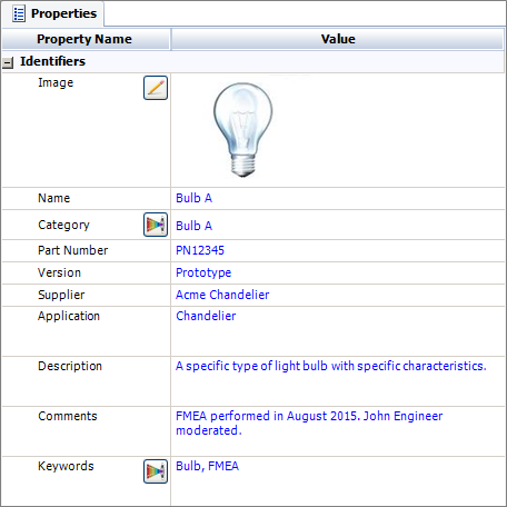 To view and edit the identifiers in Xfmea, RCM++ and RBI, select an item in the system hierarchy and go to the Properties tab in the Analysis panel. The same set of identifiers will be used for all analyses associated with that item (e.g., FMEA, control plan, etc.).