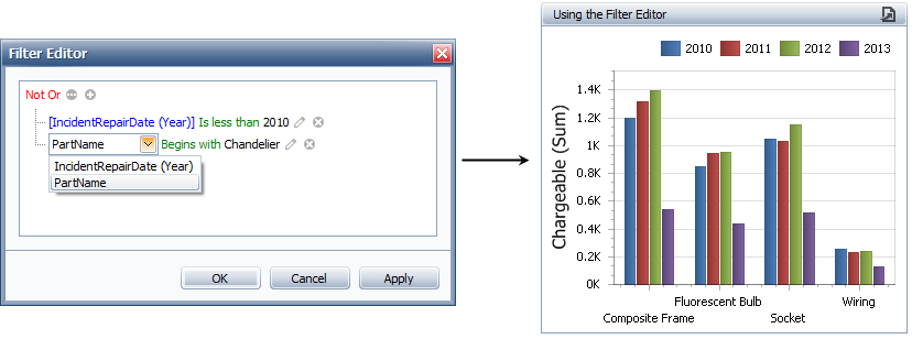 You can use the Filter Editor to incorporate filters into dashboard items that contain dimension data. Arguments and series are forms of dimension data.