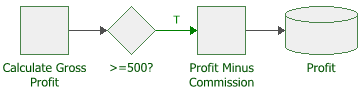 In the following configuration, the first block calculates the gross profit from a sale, and then stores its output into a variable called "Profit." The conditional block determines whether the gross profit exceeds 500. If the output is true, the third block deducts the sale's commission from the profit, and overwrites the stored value with the new output.