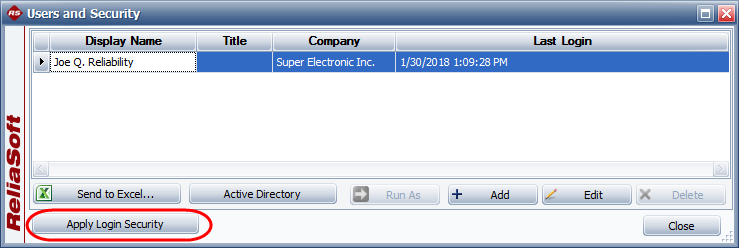 For an existing standard database, you can apply login security at any time by choosing File > Manage Repository > Users and Security and then clicking the Apply Login Security button at the lower left corner of the window.