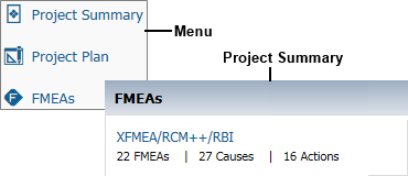 The FMEAs link in the menu opens the FMEAs page for the project that is currently active for you in SEP. This link also appears in the Project Summary page if the project contains FMEA data.