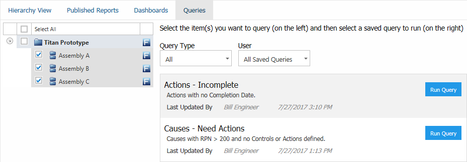 The Queries tab allows you to run queries that have been predefined in desktop applications for item properties and FMEA data This provides a quick way to get customized output based on the latest data from any analysis, such as a list of actions that are not complete, failure modes with high PRNs, and more. (See Query Templates in the XFMEA/RCM++/RBI documentation.)