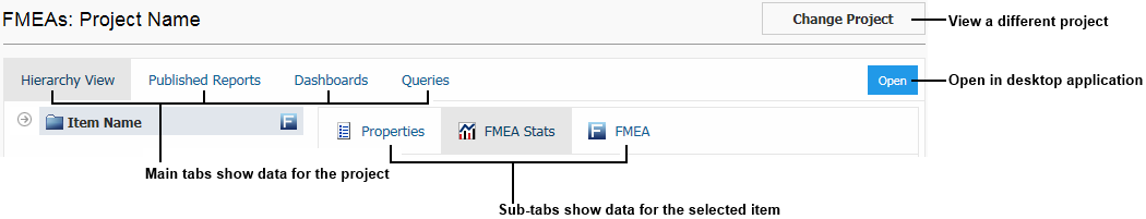 In the Hierarchy View, select an item in the system hierarchy (left/top) and use the sub-tabs (right/bottom) to navigate between the item properties, FMEA stats and FMEA hierarchy for that item.