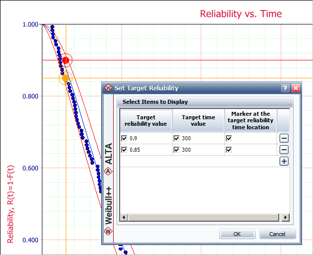You can select to show a specified target value (displayed as a horizontal line), target time value (displayed as a vertical line), and/or insert a marker at the point where the two target values intersect. Below is an example for a plot that shows the target reliability.