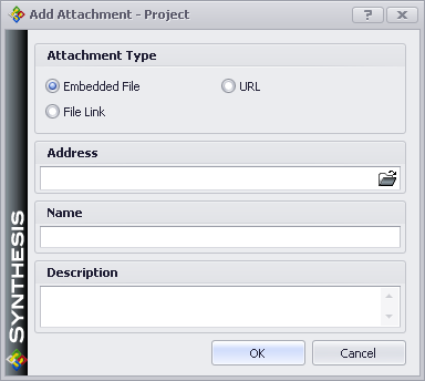 All Synthesis applications support attachments at the project level. In all applications, project attachments can be displayed/managed from the Attachments icon in the Project Properties window.