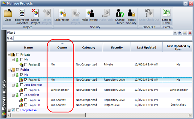 The Manage Projects window (Project > Management > Manage Projects) displays a list of all projects and their owners in a table format. You can use custom filters to filter, sort and/or group the list based on the project owner. (In a secure database, only users with the "Manage all projects" permission can access this window.)
