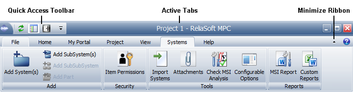 The application now has a user interface called the Ribbon, which replaces the toolbars and menus of previous versions of the software. This interface is designed to improve efficiency by displaying only the commands you need to complete a specific task. The Ribbon is divided into tabs that relate to a task or activity, such as managing the items in the system hierarchy or performing a specific analysis. Each tab contains related commands, which are intuitively organized into groups. Depending on the activity you are performing, some commands may appear dimmed or will not appear at all.