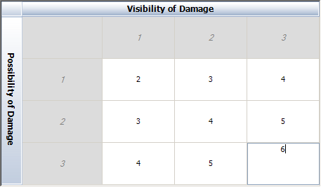 The following picture shows a matrix for three point rating scales. In this case, the matrix assigns a score of 6 if both the possibility and visibility of damage are assigned to the lowest ratings (i.e., low possibility of damage and high probability that any damage would be visible). You can change the score labels to fit the particular rating system used by your organization.