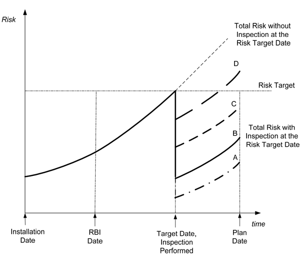 The API defines failure as the loss of containment from a pressure boundary resulting in leakage to the atmosphere or a rupture of the pressurized component. Throughout a given period of time, damage will accumulate within a pressured environment. That damage causes increased risk of failure to equipment and components. After a significant amount of damage, a predetermined risk target is exceeded and an inspection of that component is recommended to better understand and measure the damage.