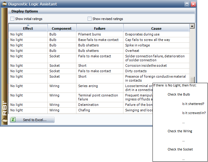 Starting in version 9.0.2, the Diagnostic Logic Assistant window makes it easy to extract relevant data from the FMEA into Microsoft Excel, where you can organize and filter it as needed when preparing supporting documentation. To access the utility, choose Home > Reporting > DLA.