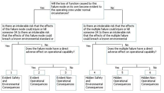 This diagram has 5 questions with 6 failure effect categories. Other published logic diagrams may consist of 3 or 4 questions with 4 or 5 failure effect categories.