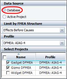 Database: With this option, you must specify a Profile and FMEA Structure. You can then select to query any or all of the projects in the current database that use the specified FMEA structure (i.e., grouped effects and causes, causes before effects, etc.). The criteria and results will use the property names from the selected profile.