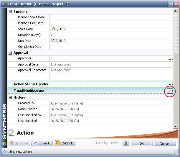 Approval Date: The date when the action was approved. This will change the action's status to approved. This date is entered automatically when the approver clicks the Approve button at the bottom of the Action window.