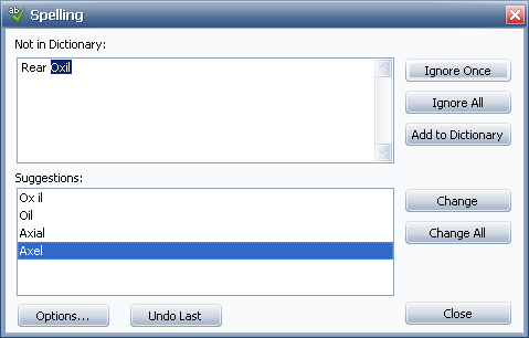 Undo Last undoes the last change that was made. This button will be enabled if the field contains more than one word that is not in the dictionary. If you change one word, the spell checker will remain open so you can decide what to do with the next one and the Undo Last button will become enabled.