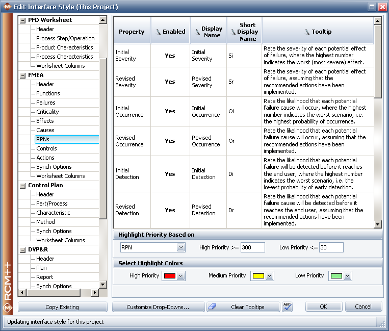 Note: On the RPNs page in the interface style, the RPN, SxO, SOD or SD metrics can be enabled or disabled within the property table (similar to any other configurable data field). However, if you want to use the customizable Risk Ranking feature, you must choose Risk Ranking from the drop-down list in the Highlight Priority Based on area and then click the Risk Ranking Logic button to define your particular preferences.