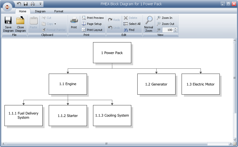 Based on system hierarchy creates an FMEA Block diagram based on the selected item and its sub-items, if any, with the names of the item and its sub-items used as the blocks in the FMEA Block diagram. One block will be created per item.