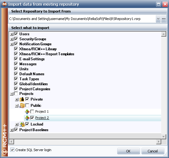 The Import Data from Existing Repository window allows you to import users, security groups and other database-level settings from an existing repository to a new standard database that you are in the process of creating. You can also import projects and other information. Note that to import data from a secure database, you need to have a valid user account in that database.