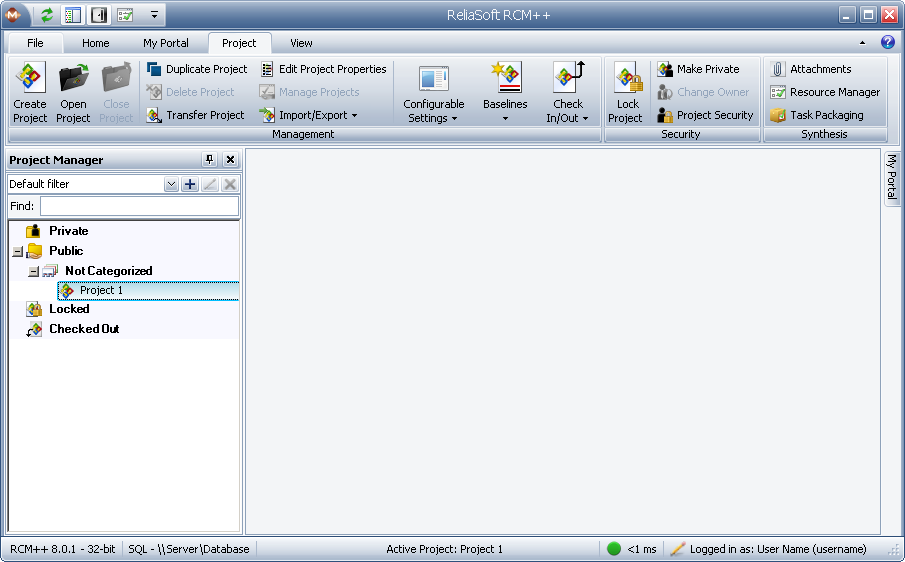 The Project Manager is docked on the left side of the MDI by default. This panel allows you to manage the projects within the current database.