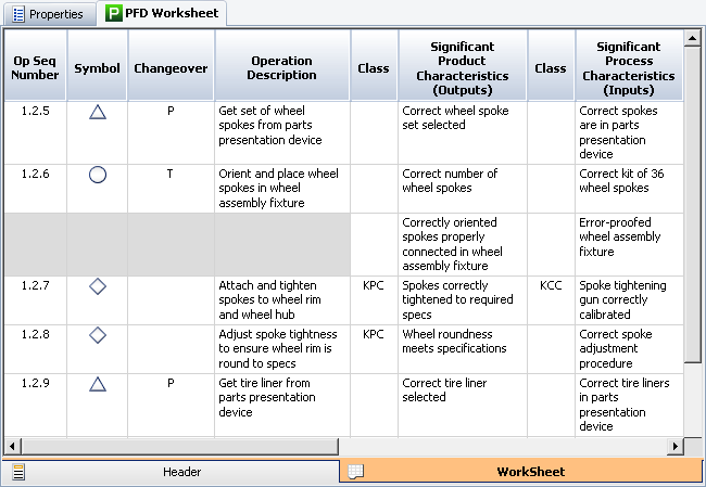 The Worksheet tab provides the structure for documenting each step that a product goes through in a manufacturing or assembly process. There are three types of records in the analysis: operation records, product characteristics records and process characteristics records. The following figure shows an example of a PFD worksheet based on the Standard FMEA profile that is shipped with the software. You can vary the format of the PFD worksheet based on your company's guidelines and standards. If you have the permissions necessary to edit the project properties, you can choose which columns will be enabled for each type of record and what they will be called. This includes user-defined fields and the ability to define the options in the configurable drop-down lists, when applicable.