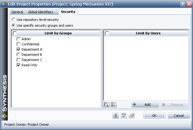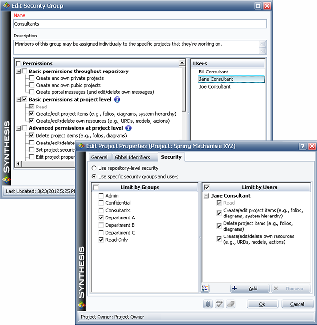 In this example, users assigned to the "Department A" security group will be able to access the project with the full set of read/write permissions that have been granted to that group, while users from other departments who are also assigned to the "Read-Only" security group will have the limited read-only permissions that have been granted to that group.