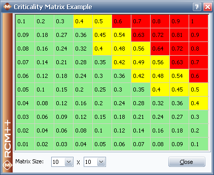 You can use the Matrix Size drop-down lists to specify the size of the previewed matrix. This can be adjusted to match the size of the matrices that will appear in reports generated from the Criticality Analysis window for your analysis projects. The size of each report matrix will depend on the number of ratings in the Criticality Scales that have been assigned in the Project Properties window.