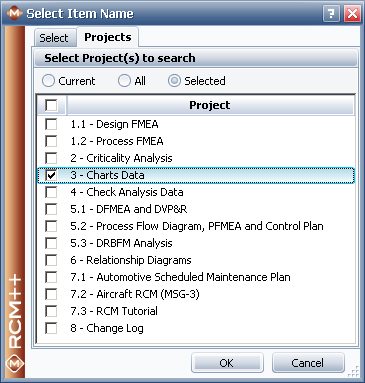 To select the project sources for the descriptions that will be displayed in the Select Existing window, click the Projects tab. This option is available for every item and record type. Each time you open a Select Existing window, it will use the same projects sources that were selected the last time you used the utility.